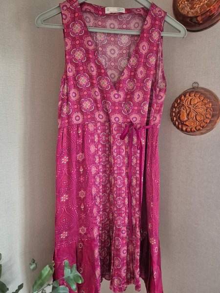 Klänning med ett livfullt mönster i olika nyanser av rosa. Klänningen har en V-ringning och ett knytband i midjan. Mönstret består av blommiga och paisley-inspirerade detaljer som ger klänningen en unik stil. Strl 1=small.