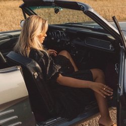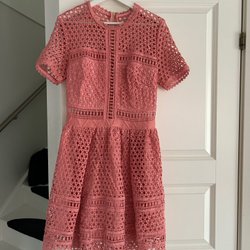 En ljusblå klänning med broderie anglaise-detaljer. Klänningen har puffärmar och knappar framtill. Midjan är markerad och kjolen har en volang nedtill.