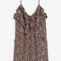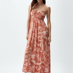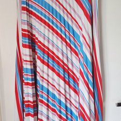 Klänning med en svart halterneck-topp och en plisserad kjol med blommigt mönster. Kjolen har ett livfullt mönster med blommor i olika färger som rött, blått och svart, samt horisontella ränder i kompletterande nyanser. Toppen har en elegant knytning i nacken. Superfin klänning inköpt I London och passar perfekt till events.