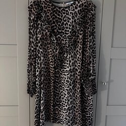 Elegant klänning från Co'Couture med en vacker brun färg och ett unikt mönster. Klänningen har en smickrande v-ringning och en bekväm passform. Lättskött material. 100% polyester. Gummiband i midjan. Sprund fram. Storlek S, men passar en S-L. Använd 1 gång. Nypris 1499kr.