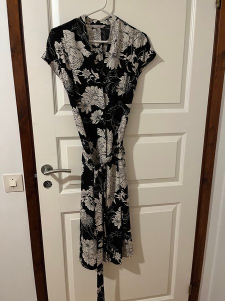 Klänning med kort ärm och knytband i midjan. Mönstrad i svart och vitt.