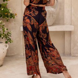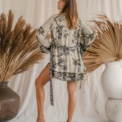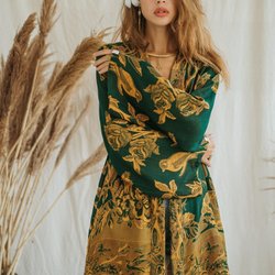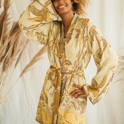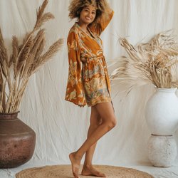 Lång, kaftan med ett vackert mönster. Den har långa ärmar och ett band i midjan och är vändbar. Perfekt för en sommarfest eller en avslappnad dag på stranden.