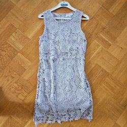 Blå klänning med ett vackert blommigt mönster i vitt och orange. Klänningen har en resår i midjan och en slits nedtill på ena sidan. Sval och skön sommarklänning. I nyskick.