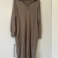 Brun stickad klänning med långa ärmar. Klänningen har en enkel och stilren design.Storlek S lite figursydd i midjan .Aldrig använd