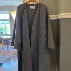 Designen, med rundad halsringning, markerad midja med rynk, långa ärmar med resår samt ett lätt fall i kjolen, är ett vackert statement-plagg som både känns lyxigt och avslappnat.