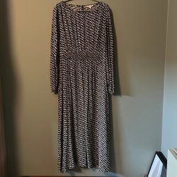 En stickad klänning med långa ärmar. Klänningen har en rund halsringning och en rak passform.