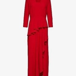 En elegant röd klänning med en unik design. Klänningen har en halterneck-stil med en utskärning framtill och en hög slits på kjolen. Perfekt för speciella tillfällen.