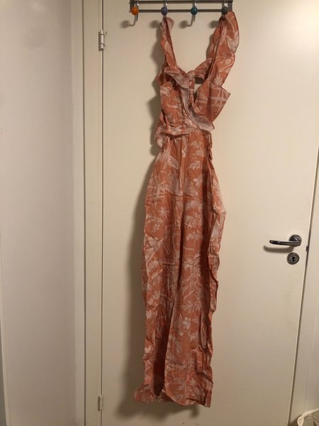 Lång klänning med ett blommigt mönster i en persikofärgad nyans. Klänningen har en knytdetalj framtill.