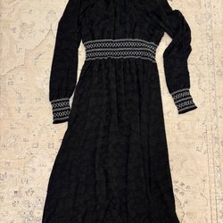 Denne sorte kjole har lange ærmer og en rund halsudskæring. Kjolen har udskårne detaljer i ærmekanterne og forneden, der tilføjer et unikt præg. Den er velegnet til forskellige lejligheder.