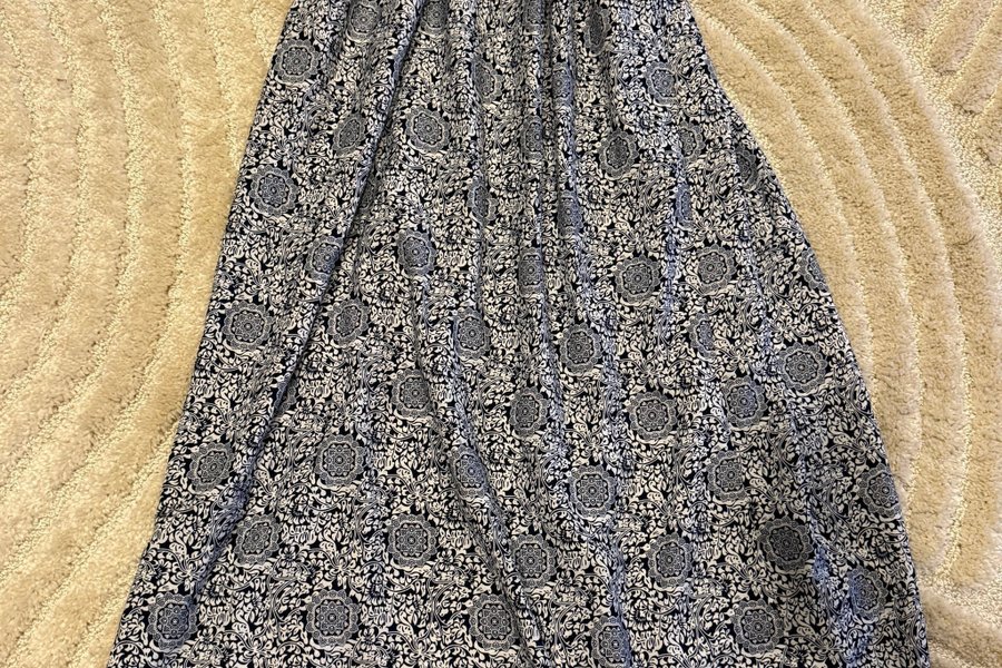 Långklänning med smala axelband och ett vackert blommönster i blått och vitt. Klänningen har en smickrande passform och ett dekorativt band längst ner.