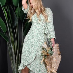 Rosa klänning med ett vitt mönster. Klänningen har en v-ringning och ett band i midjan som kan knytas. Den har korta ärmar och en avslappnad passform.