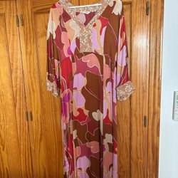Lång klänning med mönster i flera färger. Klänningen har smala flätade axelband och en resår i midjan. Överdelen har en snörning framtill med dekorativa tofsar och lövformade detaljer.