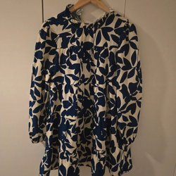 Blå kjole med lange ærmer og V-udskæring. Kjolen har en løs pasform og en længde, der går til knæene.