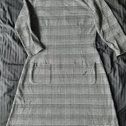 En svart klänning med knappar framtill och en skärp i midjan. Klänningen har korta puffärmar och en rak siluett.
