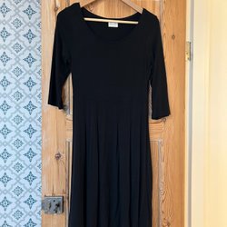 Långärmad stickad klänning från Lindex med flätmönster och band i midjan i mycket fint skick, använd fåtal gånger. Klänningen är i en rak modell med borttagbart band i midjan och slits på ena sidan.