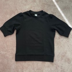Svart klänning med axelvaddar, v-ringning och tre fjärdedels ärmar. Klänningen har en figursydd passform och en dragkedja i ryggen.