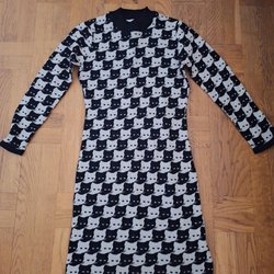 Strl xs- mått: äh-äh: 46cm, längd från axel 107cm. Fint fall i kjoldelen. Vackert mönster : marinblått, rött och vitt. Fickor i sidorna.