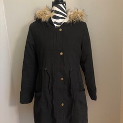 Mörkblå klänning med huva och trekvartsärm. Klänningen har en avslappnad passform och en enkel design.