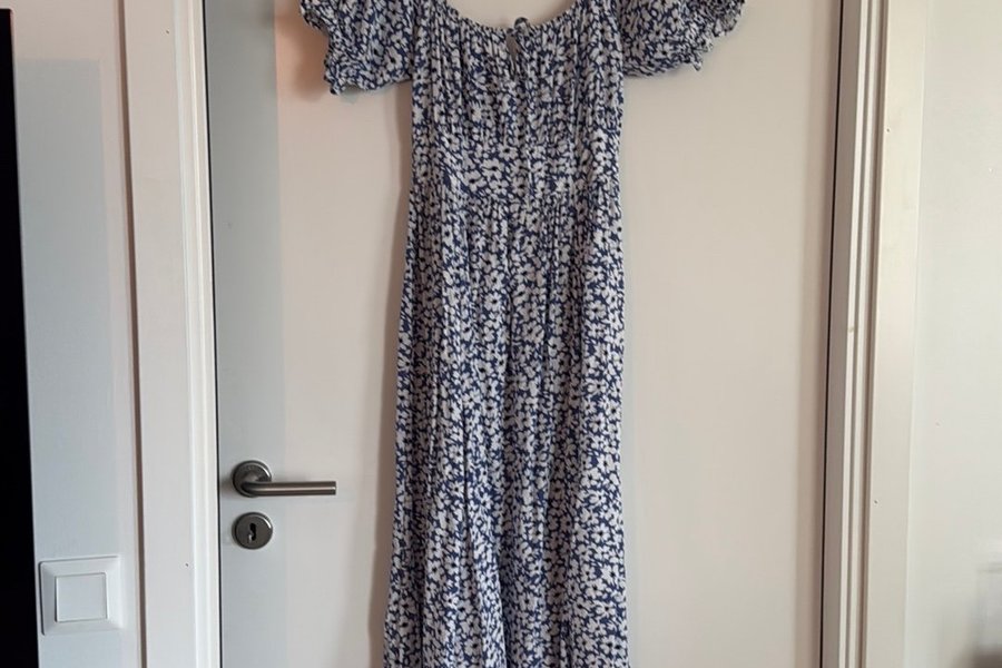 Blå och vit blommig klänning med puffärmar och knytband framtill.