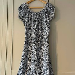 Mörkblå klänning med fyrkantig halsringning och puffärmar. Klänningen har en smickrande, rynkad design. Endast använd en gång storleken är Xl men skulle säga att den passar även L