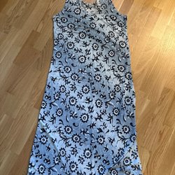 Denne lilla kjole med hvide tusindfryd er et alsidigt stykke tøj, der kan bruges til forskellige lejligheder. Kjolen har lange ærmer og en rund halsudskæring. Med underkjole.