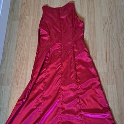 En hemmasydd blå-blommigklänning med smala axelband och dragkedja i ryggen. Klänningen har ett mönster av vita blommor och vertikala ränder. Storlek mellan xsmall-small