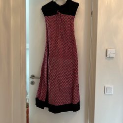 Klänning med en elegant omlottdesign upptill och en markerad midja med ett spänne. Klänningen har korta ärmar och en figurnära passform som slutar vid knäna. Står ingen storlek i den men gissar 36-38