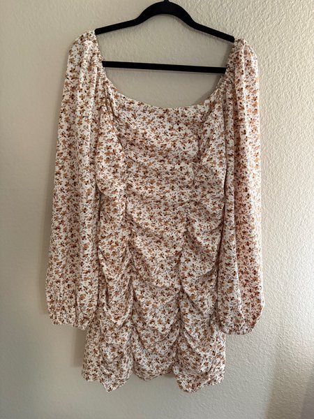 Klänning med långa ärmar och fyrkantig halsringning. Klänningen har en mönstrad design med små blommor.
