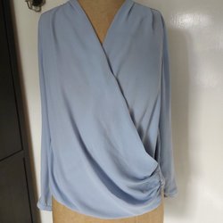 Ljusblå blus med långa ärmar och en elegant V-ringning. Blusen har en knappslå som går en bit ner på framsidan, vilket ger en stilren och sofistikerad look. Perfekt för både vardag och fest.