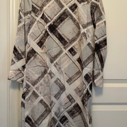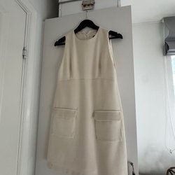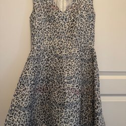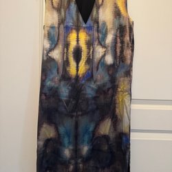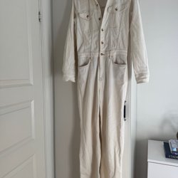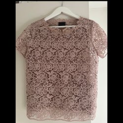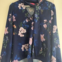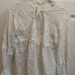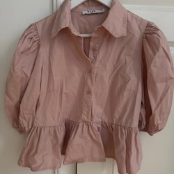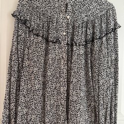 Ljusblus med ett svart blommönster och långa ärmar med volangdetaljer. Blusen har en rund halsringning och stängs med en dragkedja i nacken.