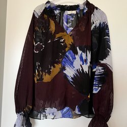 Blommig blus med långa ärmar och knytband i halsen. Blusen har ett fint blommönster i rosa, lila och svarta toner. Den har en avslappnad passform och är perfekt för både vardag och fest.