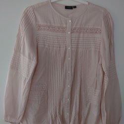 Rosa, kortärmad blus med ett genombrutet, dekorativt mönster. 95%polyester och 5% spandex.
