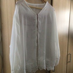 Vit blus med långa ärmar och spetsdetaljer. Blusen har en fyrkantig halsringning med spetskant och flera våder med spetsinfällningar nedåt.