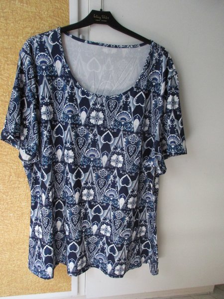 Blå och vit mönstrad blus med korta ärmar och rund halsringning. Mönstret består av hjärtan, blommor och andra dekorativa element.