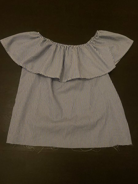 Off-shoulder blus med ett randigt mönster i blått och vitt. Blusen har en volangdetalj över bröstet.