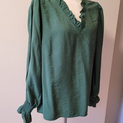 Grön blus med långa ärmar och en V-ringning. Blusen har en avslappnad passform och en något längre baksida.