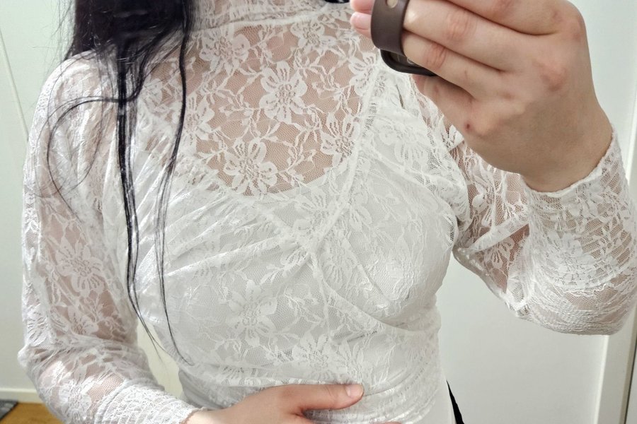 Vit spetstopp med långa ärmar och hög krage. Toppen har ett blommigt spetsmönster.