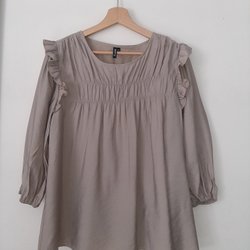 Vacker beige blus med vackra broderier och detaljer i guld. Blusen har en rund halsringning med snörning och långa ärmar. Broderierna är detaljrika och utförda med både guldtråd och pärlor. Blusen är i ett fint och luftigt material. Perfekt för festliga tillfällen eller som en elegant detalj till vardags.