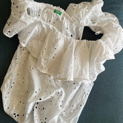 Vit blus med 3/4 ärm. Blusen har en rund halsringning med spetsdetaljer och en knappslå framtill. Den har även rynkdetaljer nedtill och vid ärmsluten.