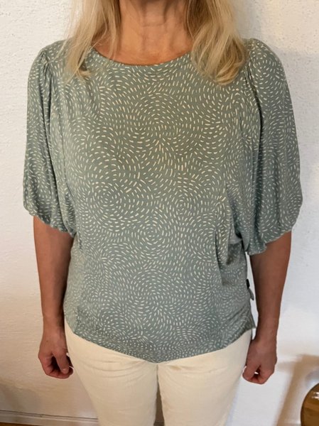 Grön blus med ett mönster i en ljusare nyans. Blusen har vida ärmar som smalnar av vid armbågen. Den har en rund halsringning och en något längre baksida.