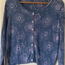Blus med ett unikt mönster av blåa cirklar i olika nyanser. Blusen har en avslappnad passform med trekvartsärmar och en kraglös halsringning med en knappslå med fyra knappar. Det finns två praktiska fickor framtill.