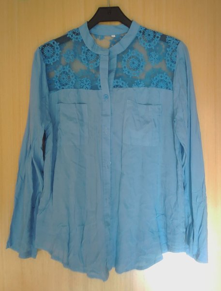 Blå långärmad blus med genombrutna spetsdetaljer över axlarna och övre delen av ryggen. Blusen har en krage och knäppning framtill. Det finns två bröstfickor med lock. Nederkanten är rundad.