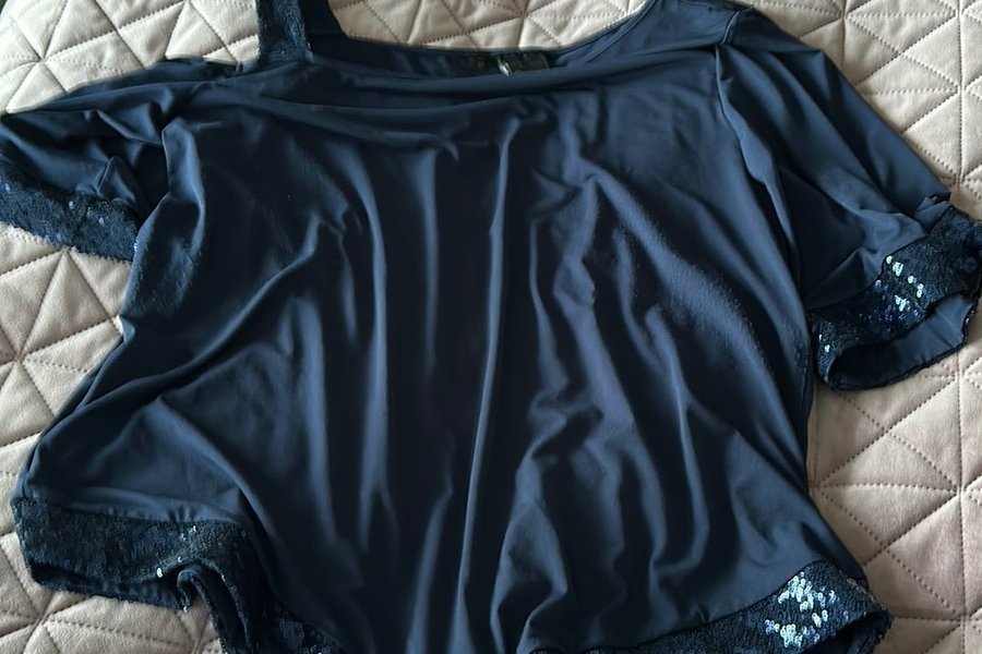 Elegant mörkblå blus med en axel och dekorativa paljetter längs kanterna. Blusen har en lös passform och korta ärmar.