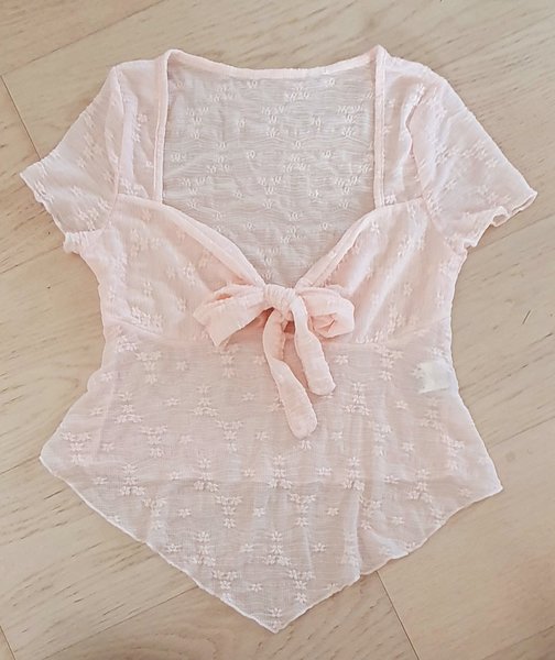 Söt, ljusrosa blus med knyt framtill. Blusen har korta ärmar och en fyrkantig halsringning. Den har ett fint blommönster.