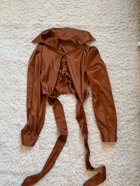 Brun blus med långa ärmar och en knytning framtill. Blusen har en krage och manschetter vid ärmsluten.