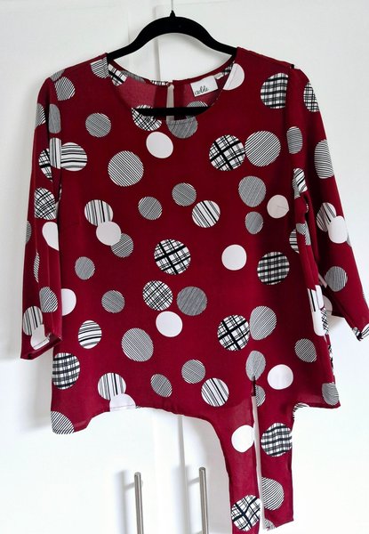 Vinröd blus med ett mönster av vita och svarta prickar i olika utföranden. Blusen har 3/4 ärmar och en unik detalj med ett extra tygstycke som hänger ned från sidan.