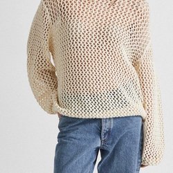 En hemstickad tröja i en ljus, benvit färg. Tröjan har ett unikt texturerat mönster över hela ytan, vilket ger den ett distinkt utseende. Den har långa ärmar och en rund halsringning.
