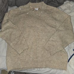 Ljusrosa stickad tröja med en hjärtformad applikation av spets och pärlor framtill. Tröjan har en rund halsringning och långa ärmar.