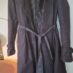 Svart trenchcoat från H&M. Den har en dubbelknäppning framtill och ett avtagbart bälte i midjan. Fodrad med ett randigt tyg.