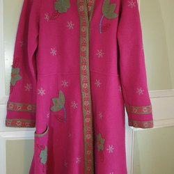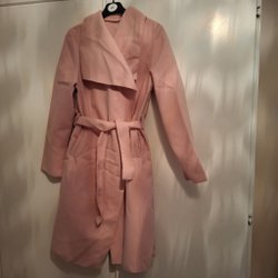 Rosa kappa med tre knappar framtill och en unik halslinje. Kappan har en figurnära passform och är fodrad med ett matchande rosa foder.